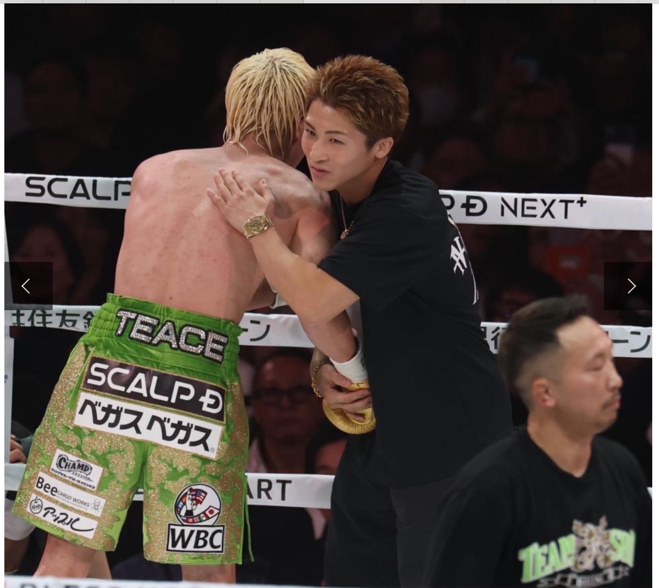 リングを去る那須川天心選手を、那須川会長が見送る場面も。